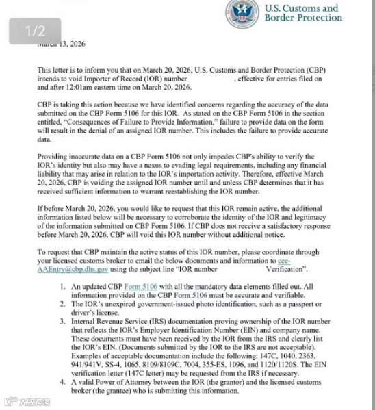 此次通知的核心在于:CBP将于2026年3月20日注销未验证的IOR编号,直接影响此后报关单效力。规避方案为向海关指定邮箱提交“IOR号码验证”邮件。