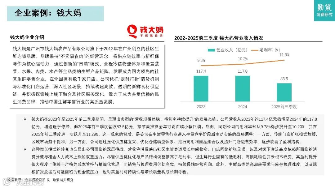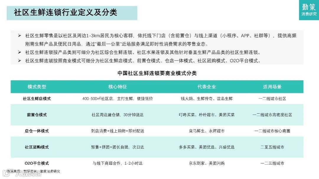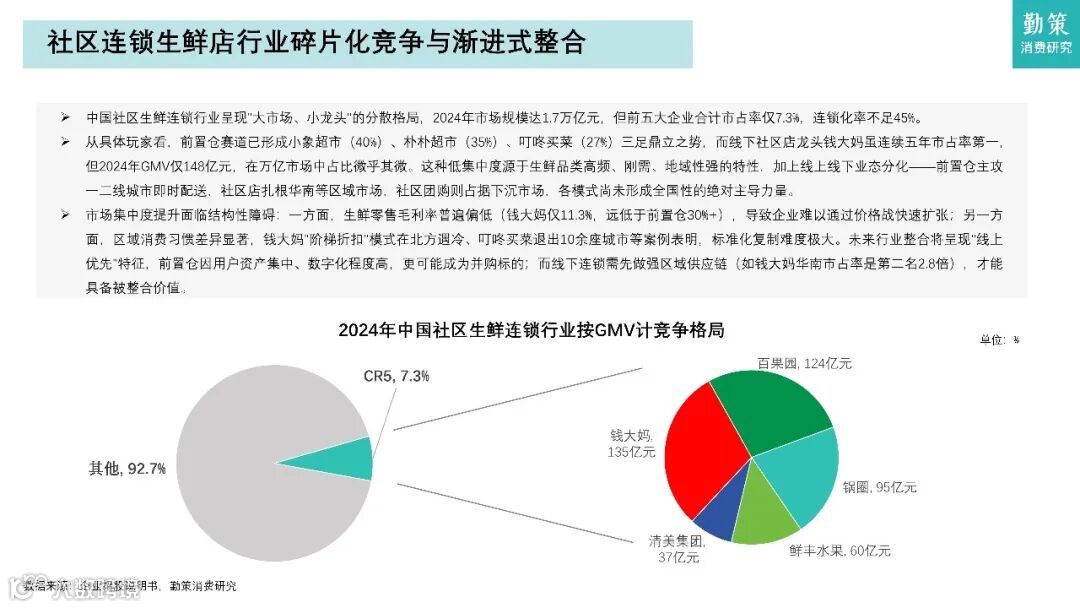 行业竞争格局呈现"大市场、小龙头"特征,2024年前五大企业合计市占率仅7.3%。主要商业模式包括社区生鲜店、前置仓、店仓一体、社区团购和O2O平台五种。钱大妈凭借"折扣日清模式"实现零库存周转,锅圈食品则通过垂直供应链领跑在家吃饭赛道。