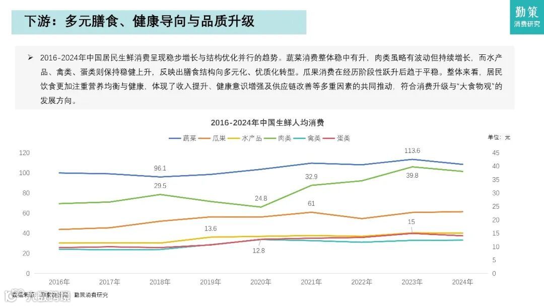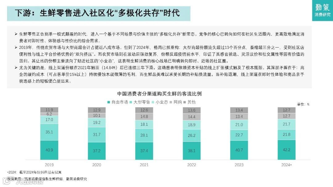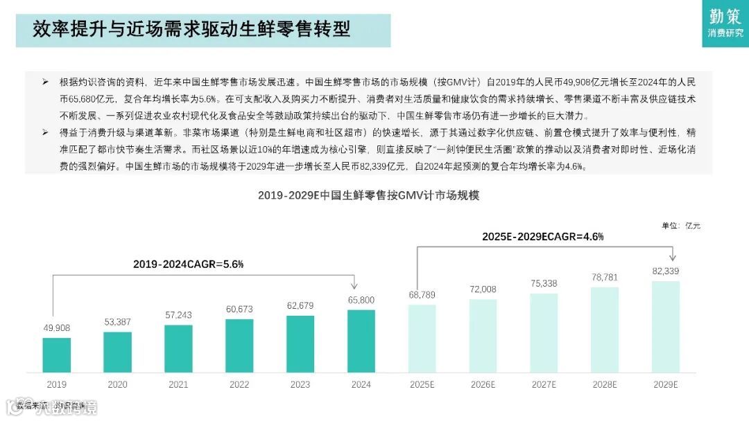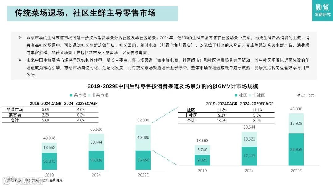 这份报告聚焦中国社区生鲜行业,核心观点是社区零售正经历效率革命与模式重构。生鲜零售市场规模从2019年的4.99万亿元增长至2024年的6.57万亿元,预计2029年达8.23万亿元。市场呈现两大结构性变化:一是传统菜场退场,社区生鲜主导零售市场,2024年近六成生鲜消费在社区场景完成;二是线下仍占约80%份额,但连锁化率将从2024年的44.7%提升至2029年的56.7%。
