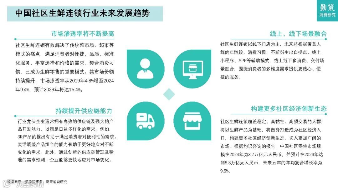 未来趋势显示,市场渗透率将持续提高,线上线下场景加速融合,供应链能力成为核心竞争力,社区经济创新生态逐步构建。行业正从单一模式颠覆走向基于不同场景与价值主张的"多极化共存"新常态。