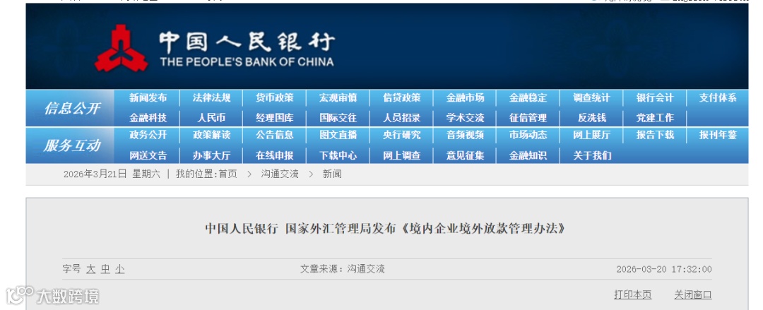 3月20日,中国人民银行、国家外汇管理局联合发布《关于印发〈境内企业境外放款管理办法〉的通知》,并同步就政策出台背景、主要内容、额度安排、登记审核标准及存量业务衔接等问题答记者问。