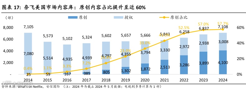 最终,快投产、短周期的运作模式,带来的是资金回笼效率的提升以及内容供给规模的持续扩张:截至2024年,单单是美国市场,Netflix就拥有超4000部原创内容,而在10年前,这一数字仅为25部。