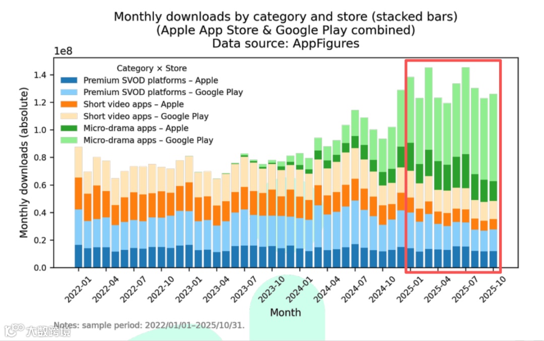 注:Premium SVOD platforms包括Disney+、HBO Max、Hulu、 Netflix等7个流媒体应用;Short video apps包括 TikTok, YouTube;Micro drama apps包括DramaBox、ReelShort、Kuku TV等下载量靠前的42个应用。