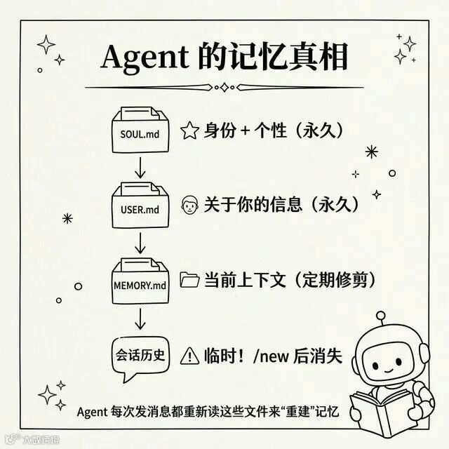 这一点特别关键。因为在 OpenClaw 这类环境里,Agent 并不是像人一样自然记住一切,而是每次发消息时,靠读取本地文件和当前会话内容,重新拼出“它现在应该知道什么”。