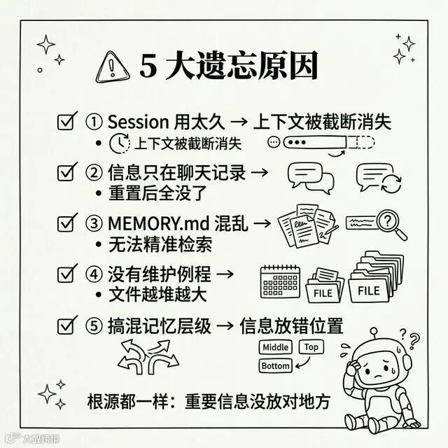 因为很多时候,不是 AI 不够强,而是你把永久记忆放进临时层,把重要信息埋进垃圾堆,再让一个超长会话把旧内容全部挤掉。