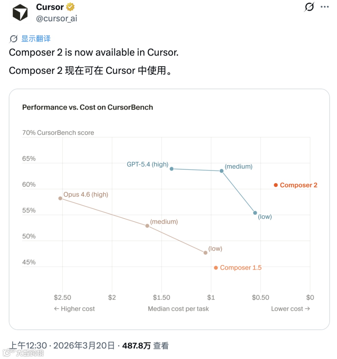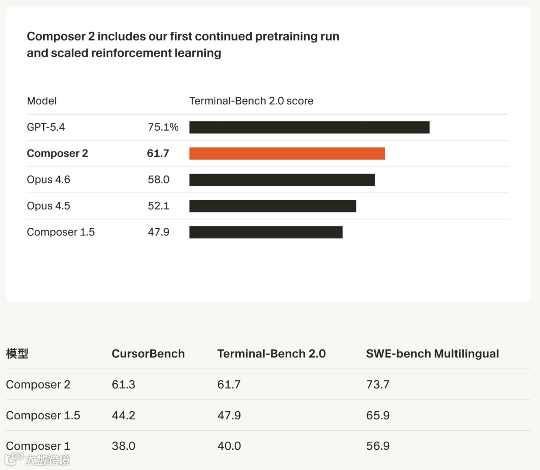3月20日,Cursor发布编程模型Composer 2,宣称其性能全面超越前代:在内部基准测试中得分从44.2跃升至61.3,超过Claude Opus 4.6(58.2),定价仅0.50美元/百万token,为Claude 1/10成本。