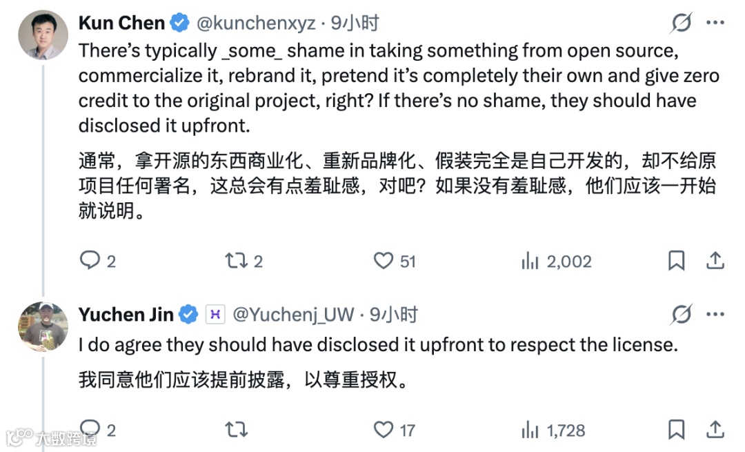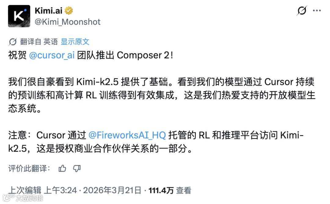 Kimi K2.5采用特殊开源许可:当产品月活超1亿或月收入破2000万美元时,需在界面显著标注来源。恰逢Cursor洽谈新融资,估值或达500亿美元(年化收入超20亿美元),条款适用性引发关注。