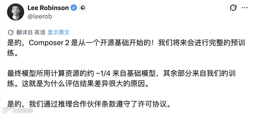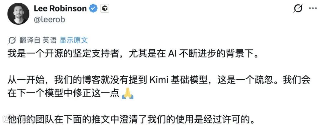 Cursor教育负责人Lee Robinson承认初始发布未说明基座是"疏忽",强调已通过Fireworks获合规授权。