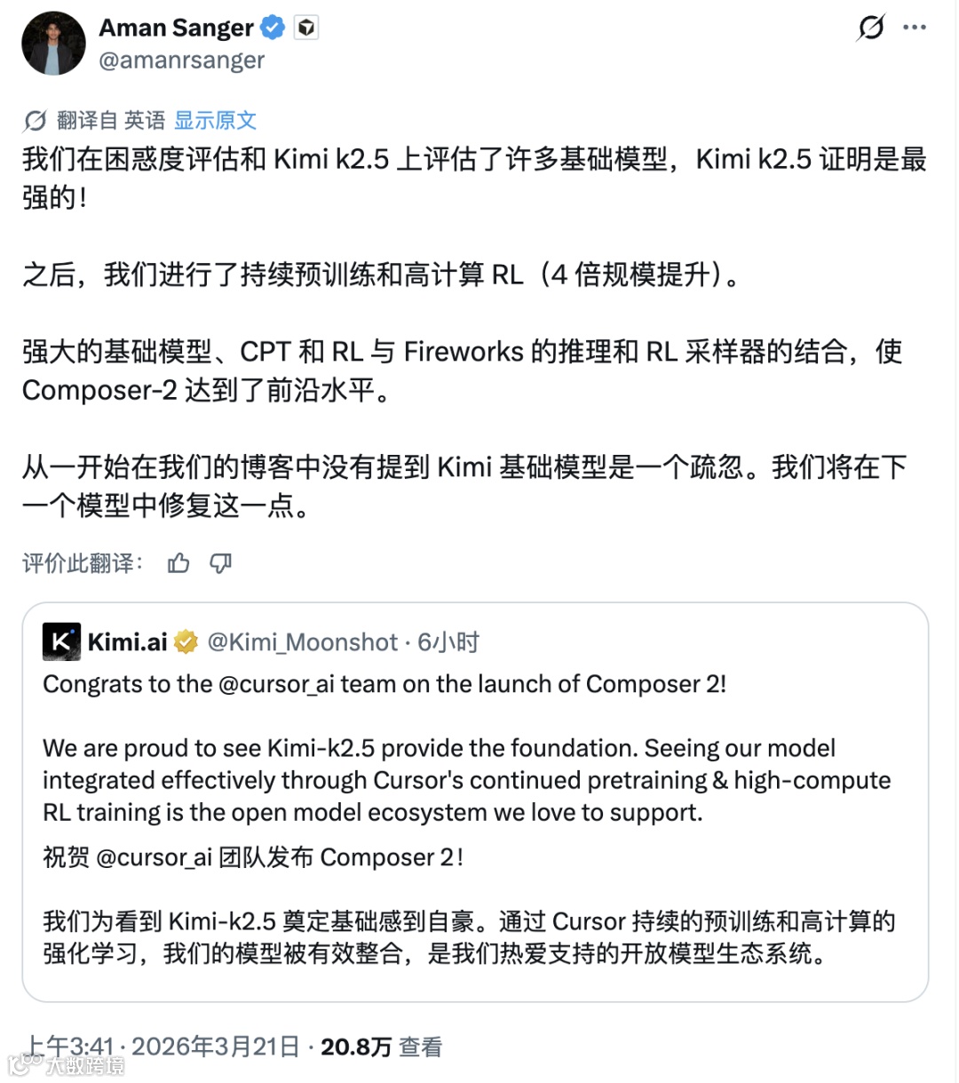 创始人Aman Sanger补充:Kimi K2.5在基准测试中表现最优,团队在此基础上进行持续预训练和4倍规模强化学习,仅25%计算量源自基座模型。