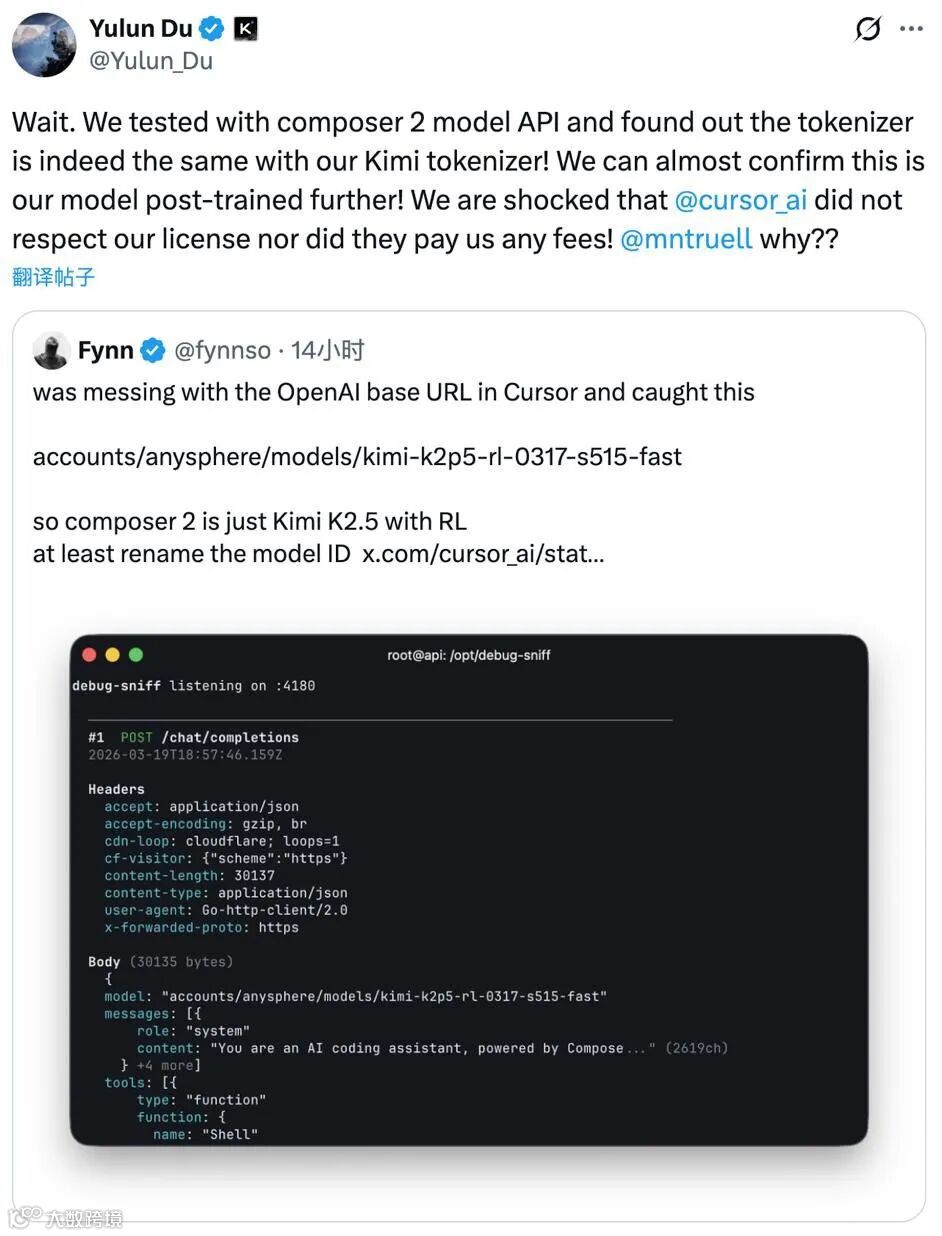 月之暗面预训练负责人Yulun Du通过tokenizer测试验证模型与Kimi高度吻合,并公开质询基座来源披露问题,另有员工发帖佐证(后删帖)。