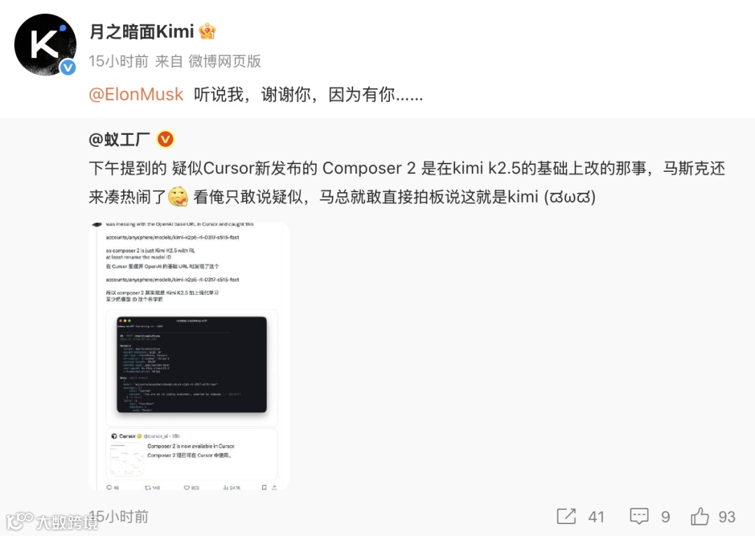 24小时内,网友Fynn通过API配置发现模型ID包含"kimi-k2p5",证实该模型实为Kimi K2.5的强化学习版本。马斯克在推文确认"这是Kimi 2.5",kimi官方随后回应"感谢有你"。