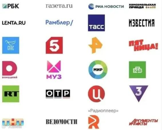消息报、РБК、俄新社、塔斯社、共青团真理报、Газета.Ru、Lenta.ru、公报、莫斯科共青团员报、俄罗斯报、生意人报、论据与事实、议会报、Rambler门户网站。电视频道类