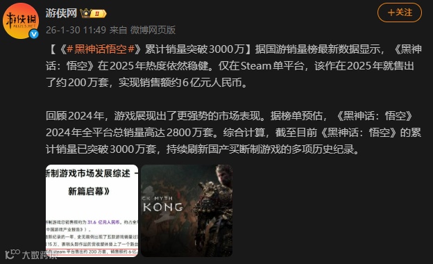 2024年8月《黑神话:悟空》全球销量突破3000万份,销售额近100亿元,开发周期6年。该游戏证明中国具备3A研发能力,与海外工作室形成鲜明对比。
