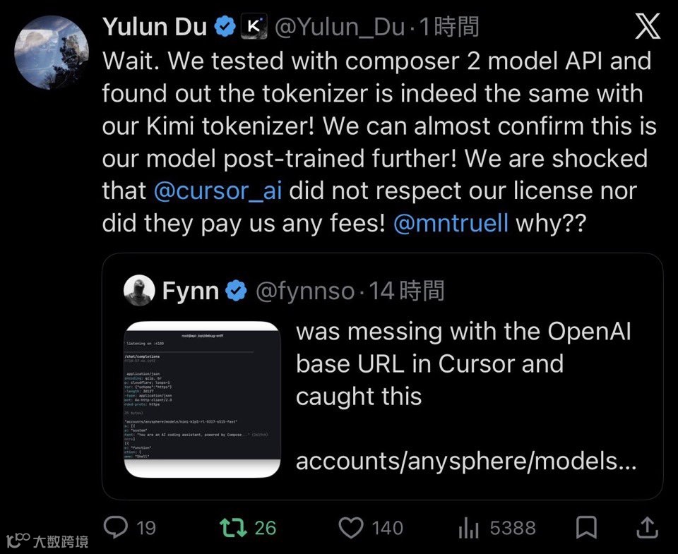 月之暗面联合创始人周昕宇证实未收到Cursor的授权申请,技术验证显示Composer 2的tokenizer与Kimi K2.5完全一致。