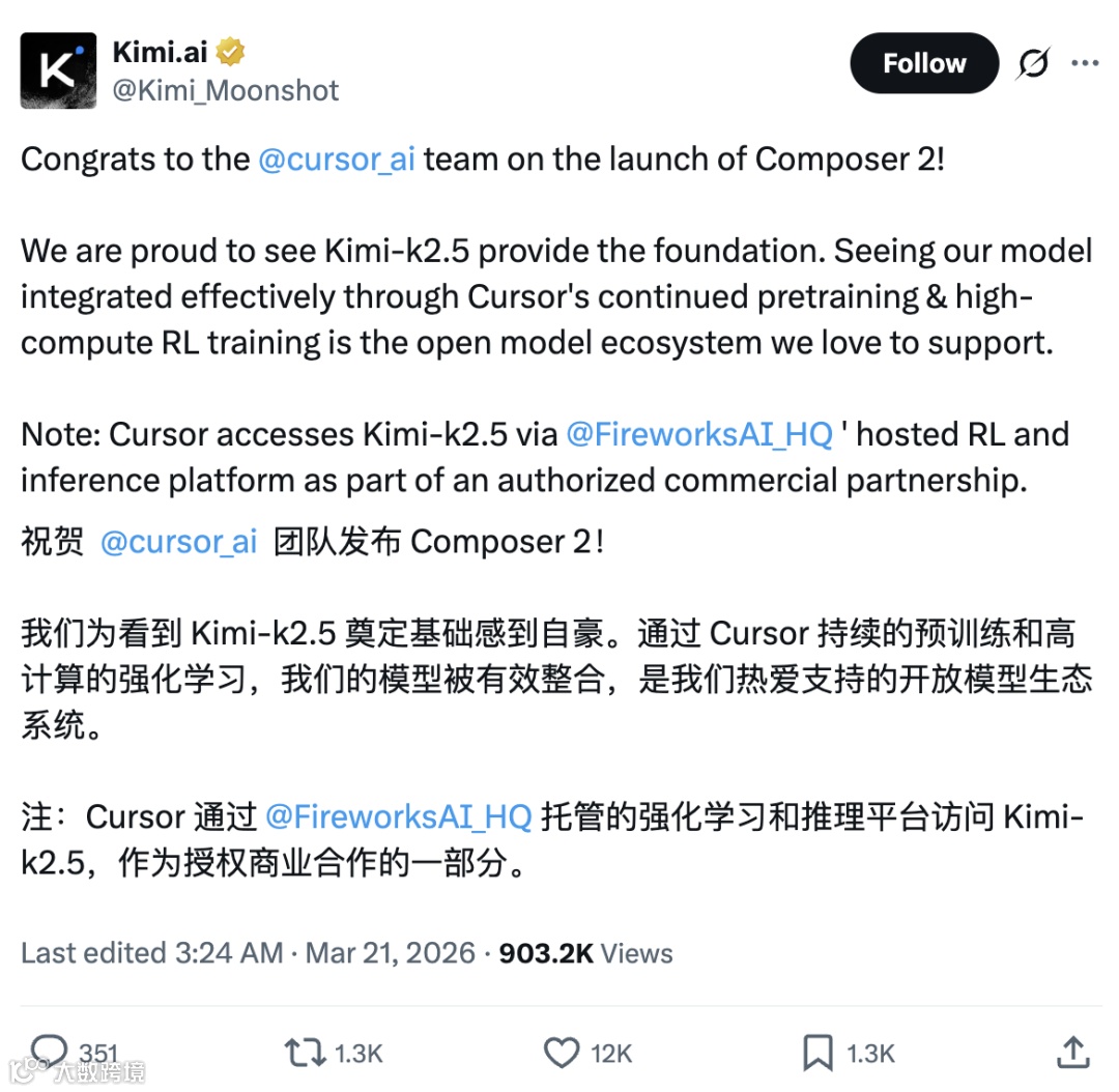 Kimi后续发布官方声明确认:"Cursor通过FireworksAI的授权商业合作使用Kimi-k2.5",但未解释为何初始声明缺失来源标注。Cursor创始人Aman Sanger称此为"疏忽"并道歉,但仍未更新技术博客说明。