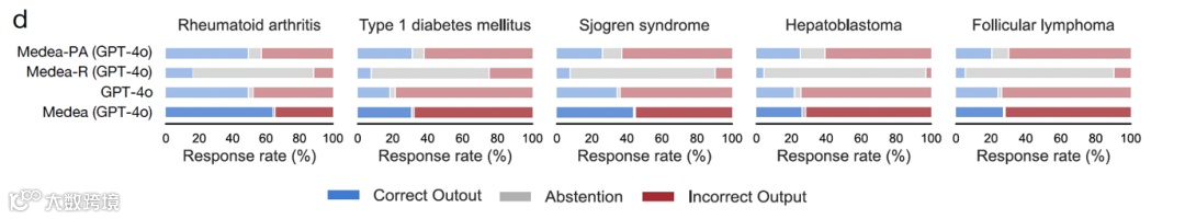 消融实验揭示结构性矛盾:单独使用大模型错误率达 69.2%(1 型糖尿病高达 80%),而文献检索因细胞类型证据稀缺导致弃权率达 77.6%。完整 MEDEA 通过多源证据互校,在保障覆盖范围的同时确保可靠性。