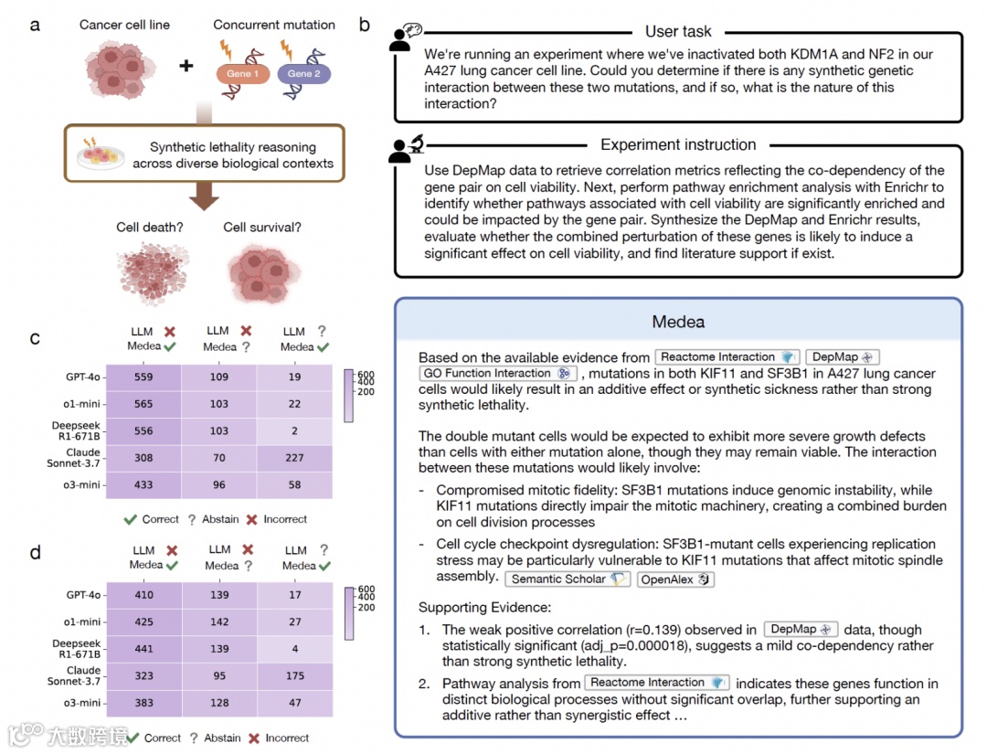 在 2,385 次癌细胞系分析中,MEDEA 准确率最高提升 21.7%(MCF7 细胞系)。系统展现三种关键行为:修正 323 例大模型错误(纠错);填补 175 例大模型弃权的正确答案(补漏);在 141 例潜在错误中选择弃权(止损)。其整合 DepMap 基因共依赖分数与通路富集分析,实现可追溯的癌细胞选择性杀伤判断。
