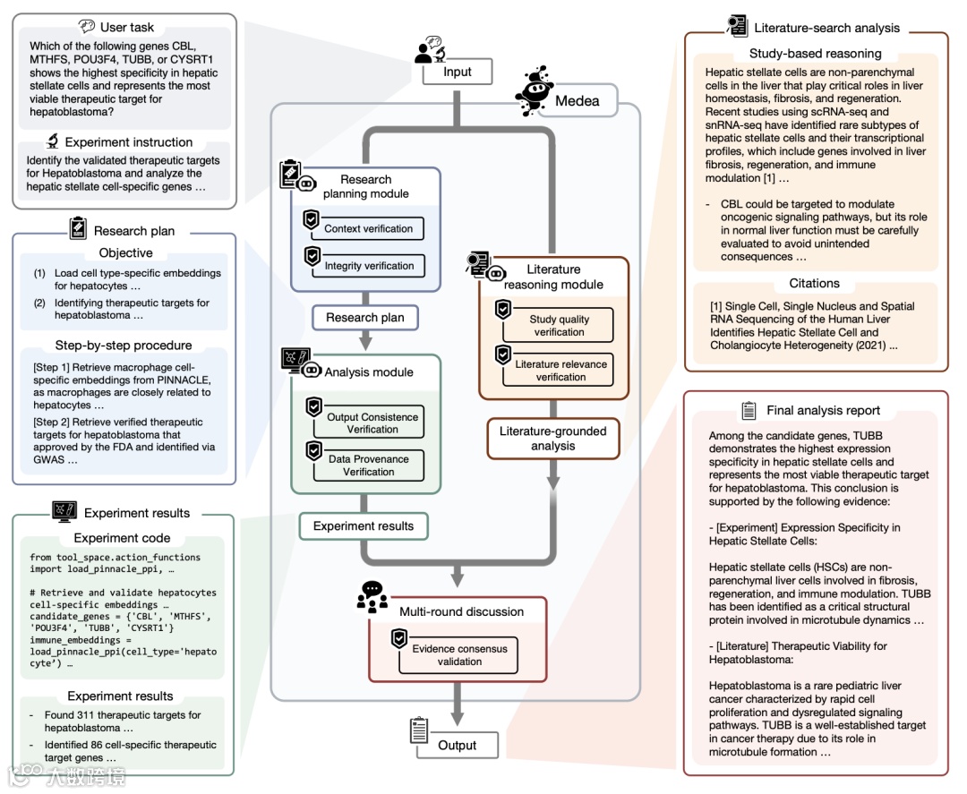 MEDEA 接受自然语言描述的研究目标,通过 20 个专业工具执行多步分析,其核心创新在于流程每一步嵌入验证机制,而非仅在最终输出时判断对错。