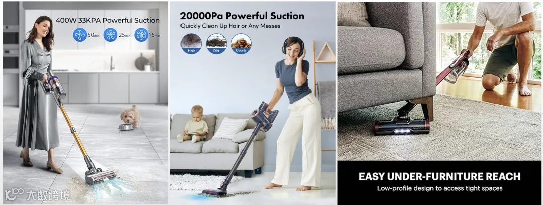 文案和图片一致,充分表达了这款吸尘器可以清理under-furniture卫生死角。