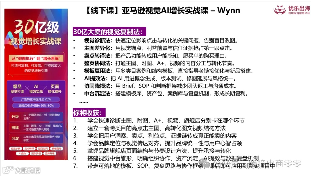 为了帮助大家弯道超车,补上这个缺口,我们特邀到Wynn老师为大家线下两天分享《亚马逊产品视觉营销&Ai提效高阶实战》。