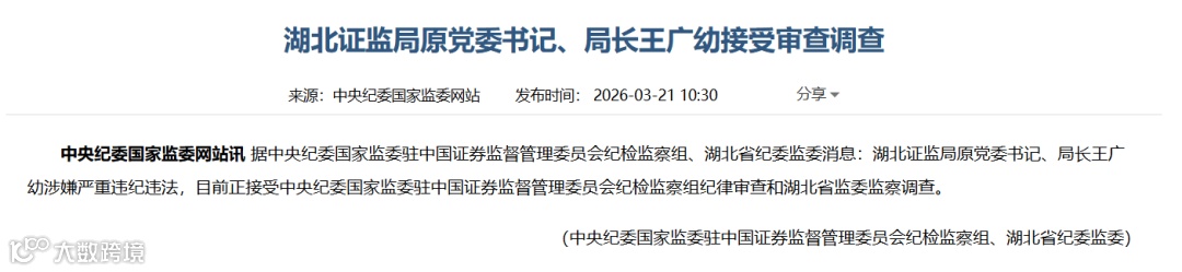 中央纪委国家监委网站3月21日讯,据中央纪委国家监委驻中国证券监督管理委员会纪检监察组、湖北省纪委监委消息:湖北证监局原党委书记、局长王广幼涉嫌严重违纪违法,目前正接受中央纪委国家监委驻中国证券监督管理委员会纪检监察组纪律审查和湖北省监委监察调查。