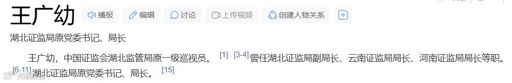 百度百科显示:王广幼此前曾任湖北证监局副局长、云南证监局局长、河南证监局局长等职。