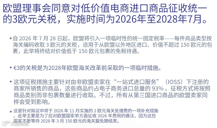 欧盟一项重磅新规将于2026年7月1日正式落地实施。该规定要求:对所有价值低于150欧元、且从欧盟境外(如中国)直接发货的电商包裹,统一征收每件3欧元的进口处理费。