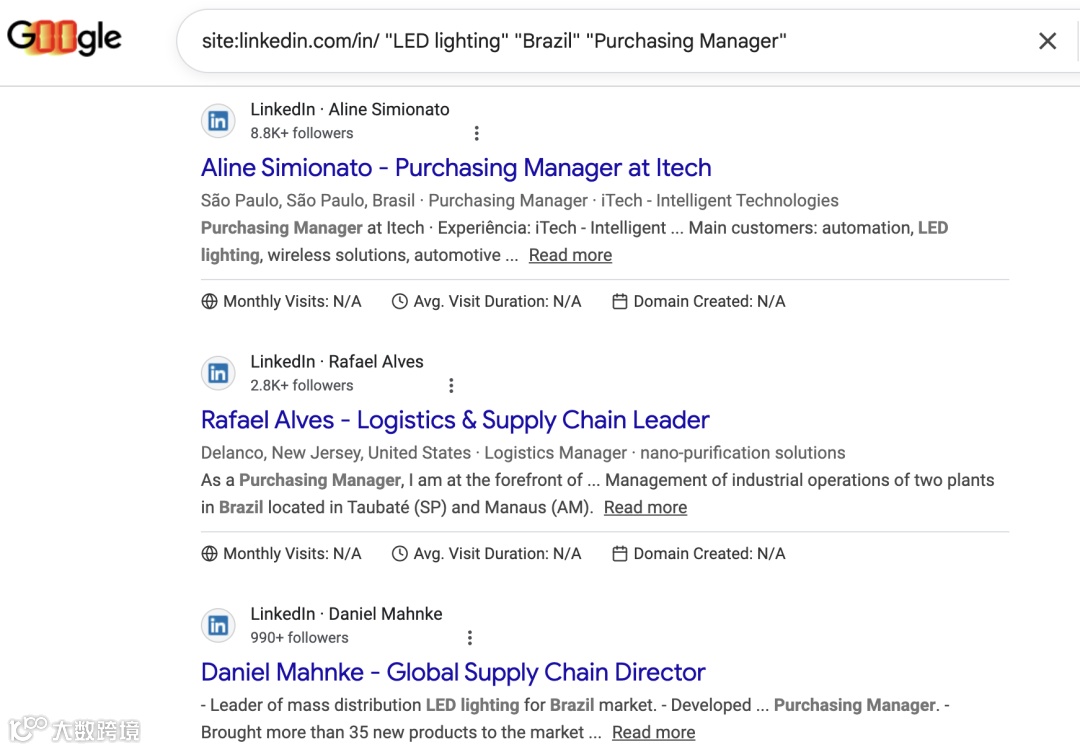 在领英里搜一个产品关键词,出来的结果里,一半是国内同行,一半是货代、物流、服务商,剩下的还有大量不对口的岗位、不相关的行业。你要一条一条翻,一个一个排查,时间全浪费在了无效筛选上。