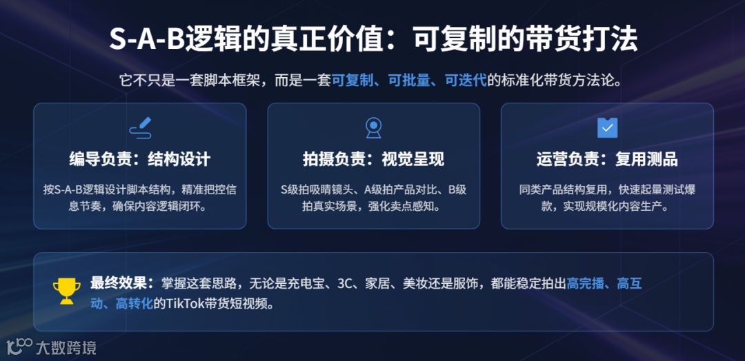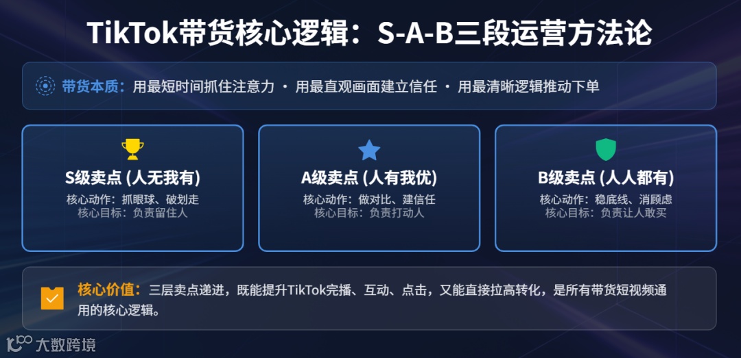 TikTok短视频带货本质在于高效抓住用户注意力、建立直观信任并推动订单转化。其核心逻辑遵循S-A-B三段运营方法论,将产品卖点按用户决策顺序重构,精准匹配平台流量机制: