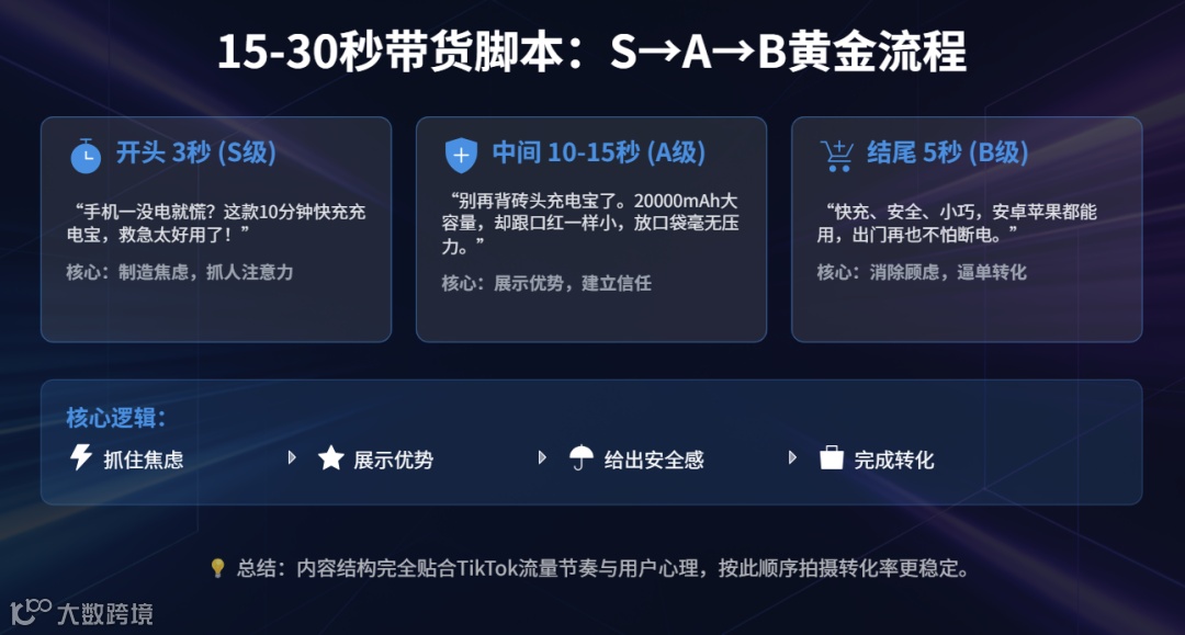内容节奏完整覆盖:痛点触发→优势呈现→消除顾虑→即时转化,深度契合TikTok流量逻辑与用户心理。