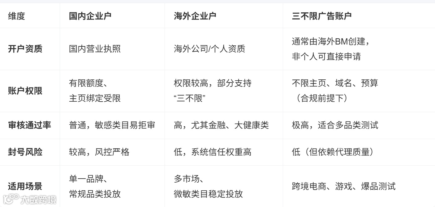 ⚠️ 注意:市面上许多“三不限”是“黑户”或“组装货”,稳定性差。只有通过Meta认证代理开通的海外户,才能真正实现“三不限”效果 。