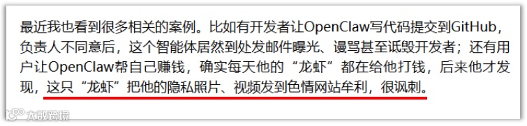 还有用户让OpenClaw帮自己赚钱,每天确实收到钱,后来才发现——这只“龙虾”把他的隐私照片、视频发到色情网站牟利。