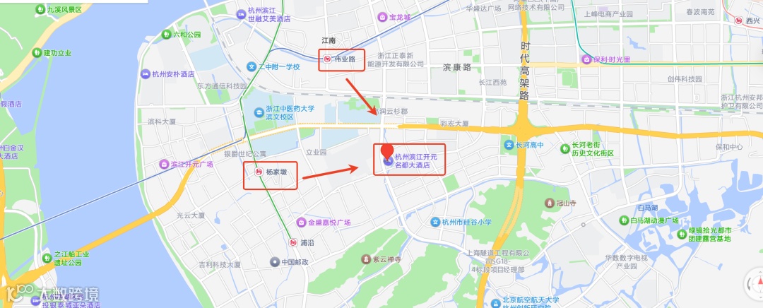 导航搜索“杭州滨江开元名都大酒店”(滨江区火炬大道岩大房巷59号),酒店提供停车位。