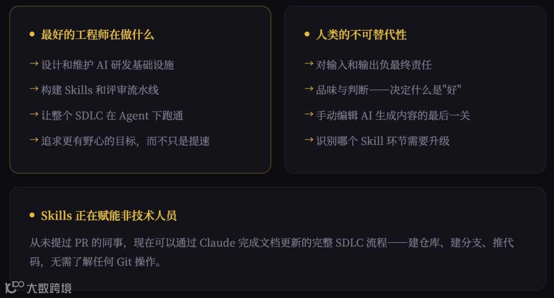 最后总结,Skills 不是让你替换工程师,而是让每个工程师都能获得他人所积累多年的专业能力。