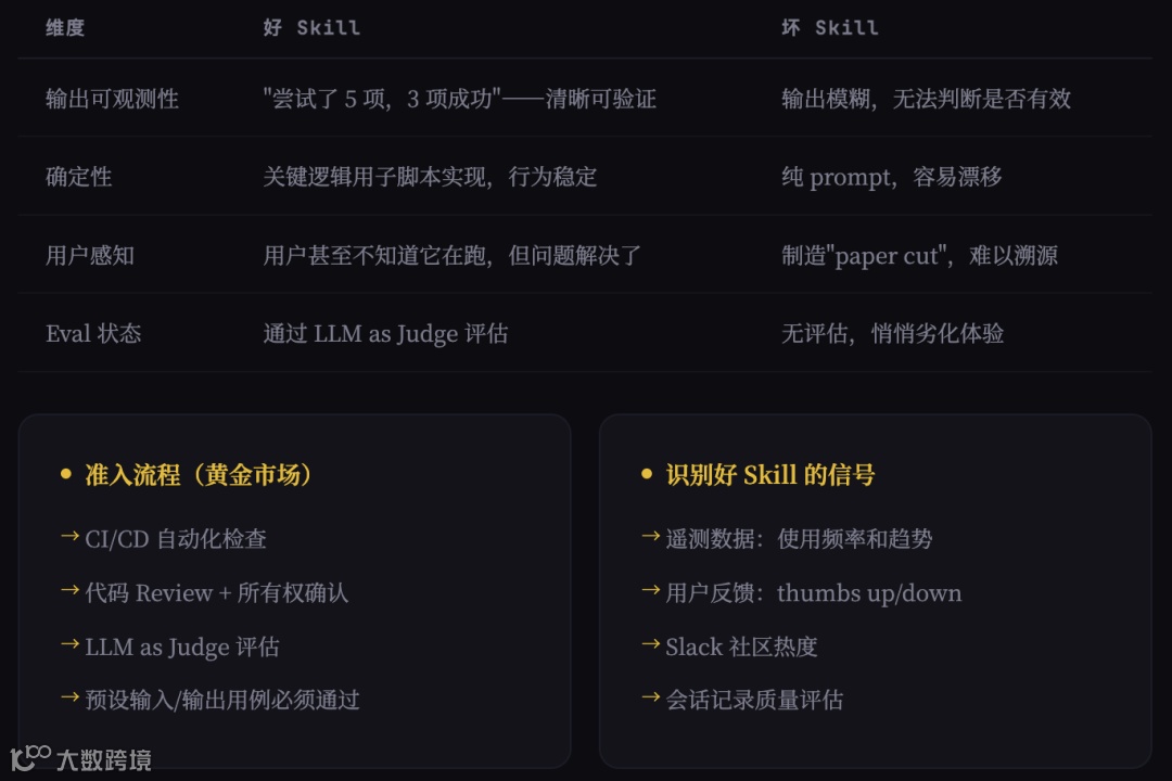 好的 Skill 通过遥测数据,用户反馈以及产出确定性有效结果的能力来衡量。