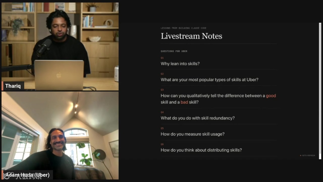 背景:主持人是 Claude Code 团队的 Thariq,嘉宾是 Uber AI 团队负责人 Adam Huda,分享在内部如何使用 Skills。