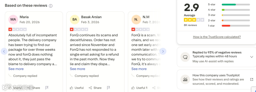 Trustpilot平台大量投诉指向延迟发货、错发商品及退款困难。例如有消费者反馈,2025年11月下单商品拖延至次年1月仍未送达,期间客服完全失联。