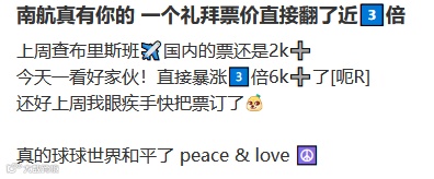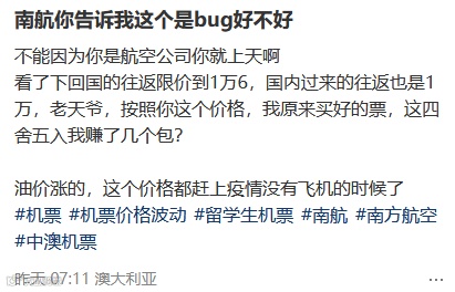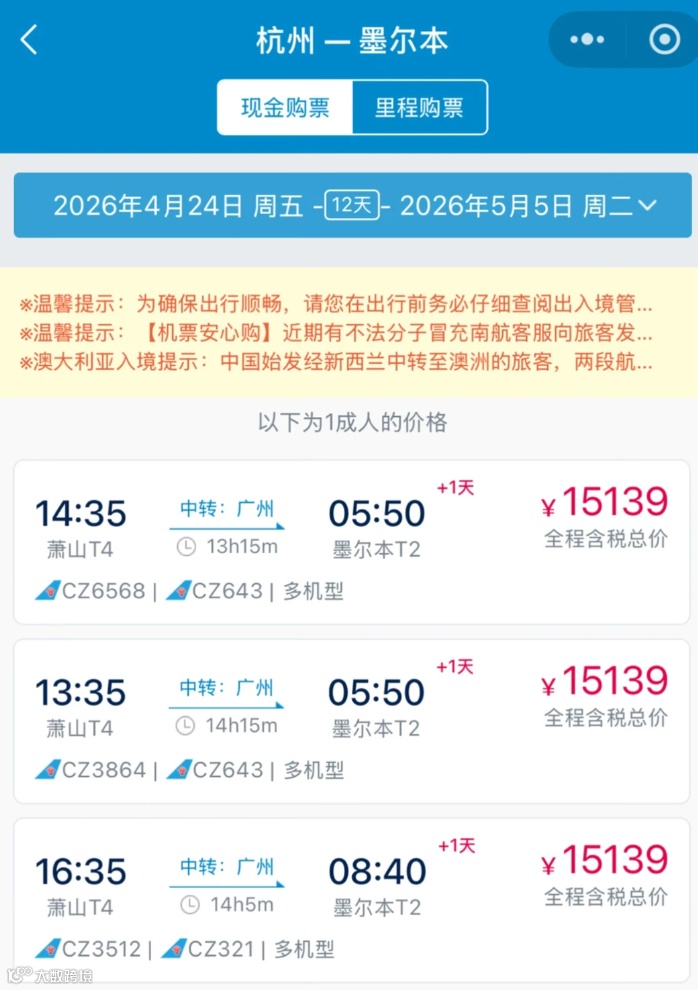 近期,中澳航线机票价格波动剧烈,出现"一天一价"现象。原本价格在2000-3000元的机票普遍涨至6000-7000元,部分航线价格甚至达到9000元以上。部分网友分享的截图显示,南航往返票价已接近1万元,杭州至墨尔本航线往返价格更是高达1.5万元。有消费者反映在购票过程中遭遇系统显示价格突然大幅提升的情况。