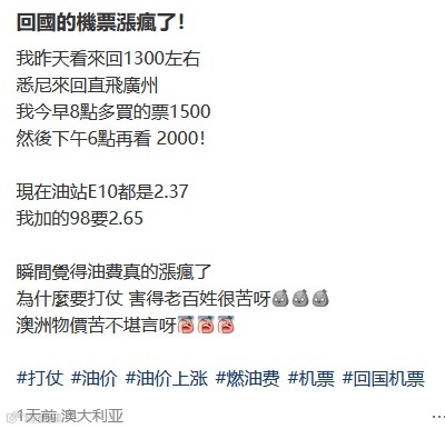 受中东战火影响,全球油价持续攀升,导致航空燃油成本大幅增加,中澳航线机票价格出现显著上涨,许多在澳华人表示归国成本大幅提高。