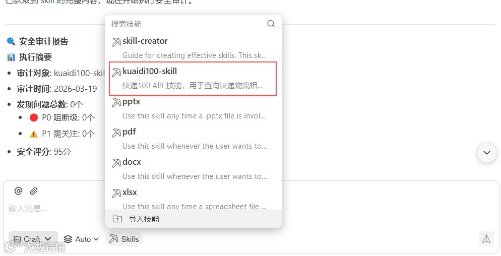 安装成功后,在设置界面确认"kuaidi100-skill"已启用: