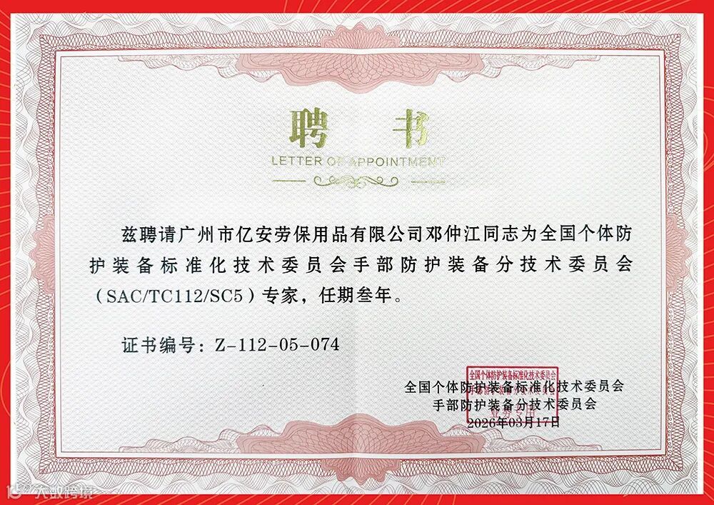 广州市亿安劳保用品有限公司邓仲江先生正式受聘为全国个体防护装备标准化技术委员会手部防护装备分技术委员会(SAC/TC112/SC5)专家,任期三年。