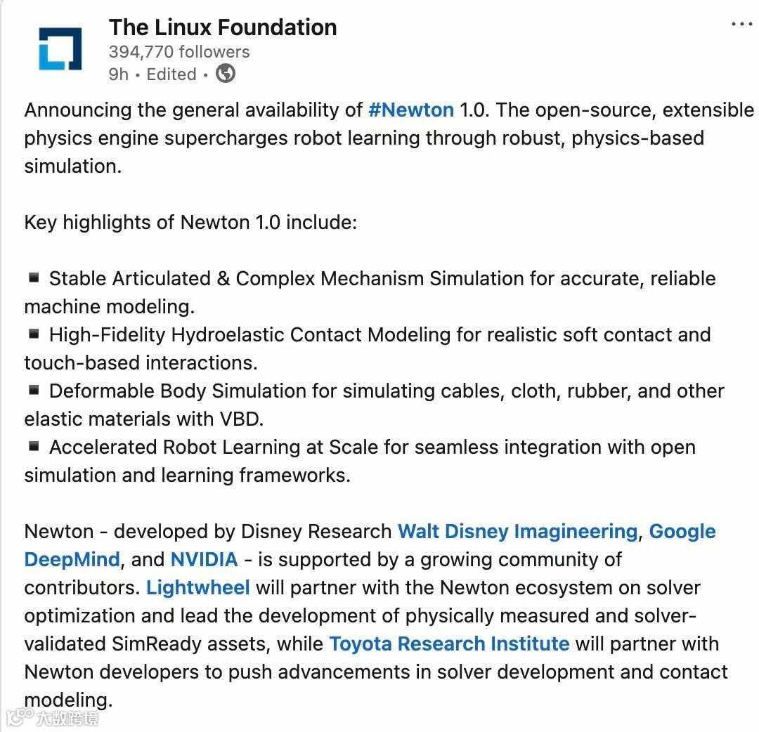更值得关注的是,光轮正从"工具使用者"转型为"规则制定者"。该公司已加入Newton技术指导委员会(TSC)。作为NVIDIA、Google DeepMind、Disney Research联合打造的Linux Foundation顶级开源物理引擎,Newton支撑着GTC舞台上的机器人角色仿真。TSC由行业顶尖专家组成,光轮CEO谢晨博士将参与核心决策,与巨头共同定义物理引擎的技术路线。