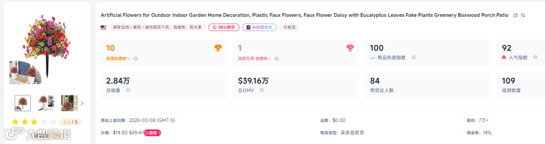 沙滩椅并非孤例。在TikTok美区的居家日用赛道,另一款来自Gubercen店铺的仿真雏菊花也成了这个春天的现象级爆款。 这款产品于3月9日上线,短短几天就冲上居家日用类目榜单第一名。上线12天,累计销量达 2.84万件 ,实现销售额 39.16万美元 (约合人民币270万元),单日销量峰值高达7000单。