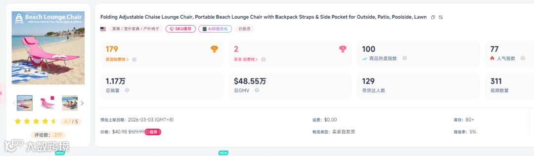 在过去的一周,一款来自中国出海品牌Sweetcrispy的沙滩折叠椅,以惊人的速度登顶TikTok美区家具类目销量榜首。 上线不到半个月的时间里,销量突破10000件,销售额超48.55万美元,折合人民币约 338万元 ,库存直接卖到断货。