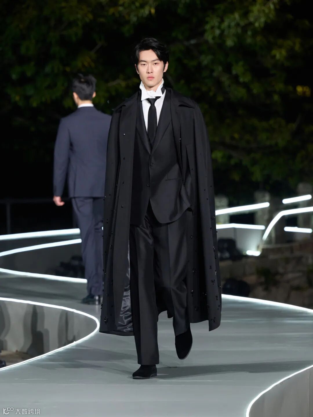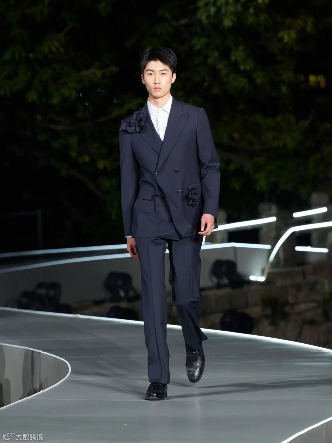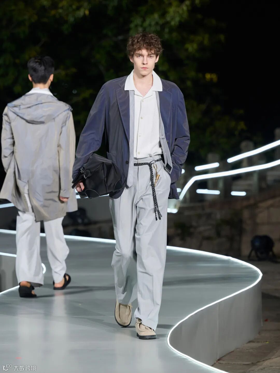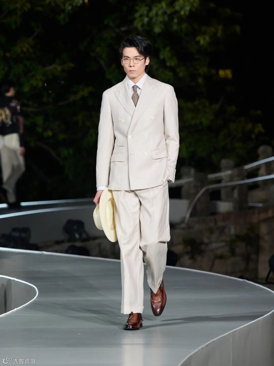 整场大秀在温州江心屿的古朴景致中展开,模特穿梭于光影之间,配合沉浸式的舞美设计,将西服从静态的展品变为流动的叙事。