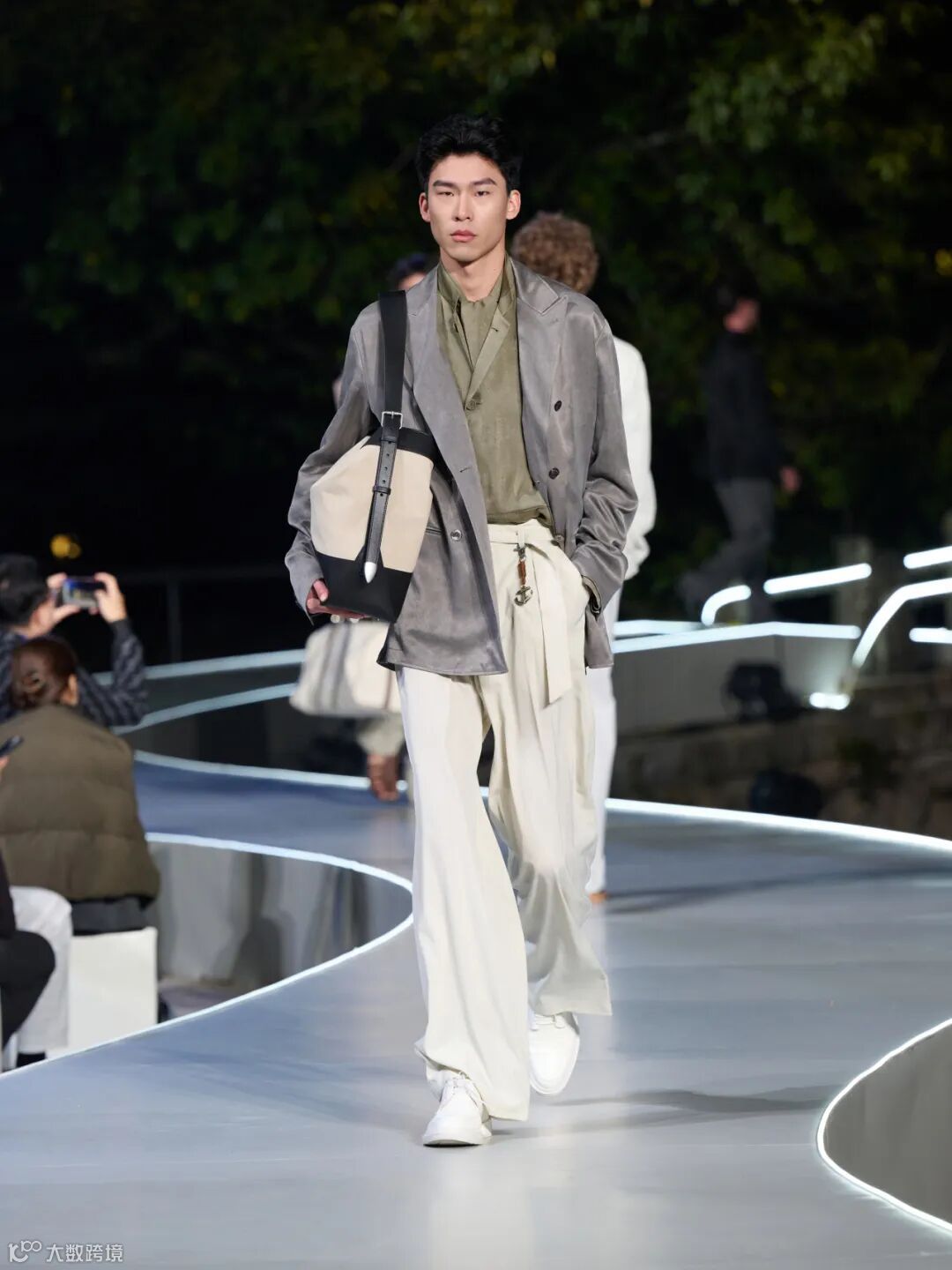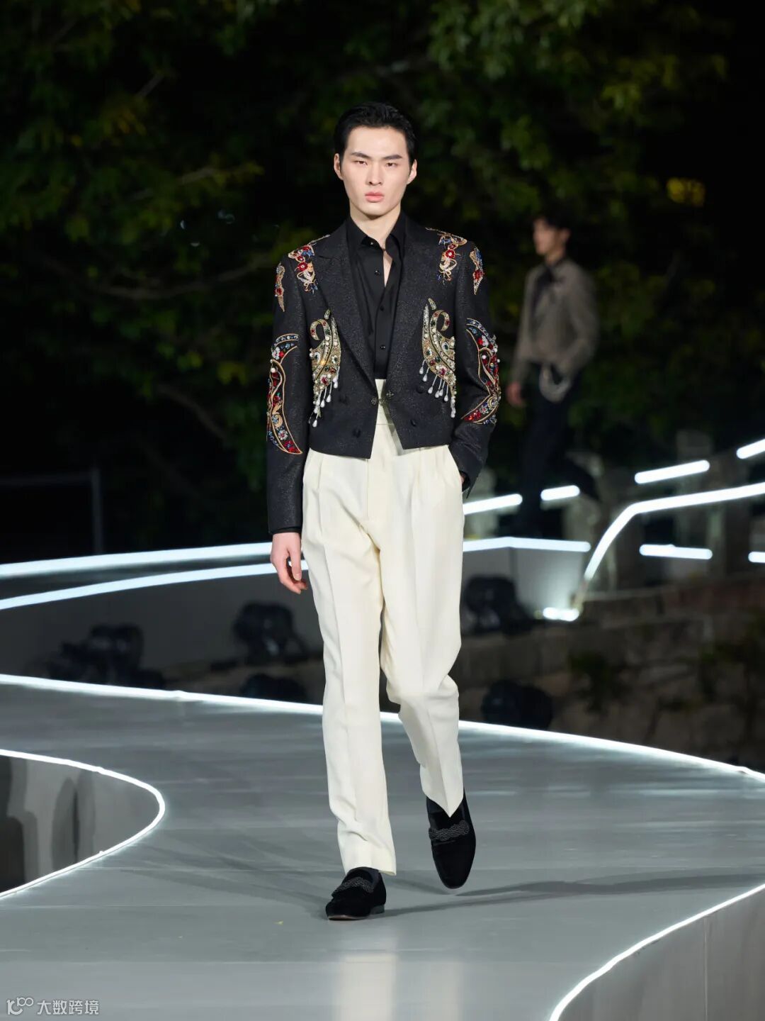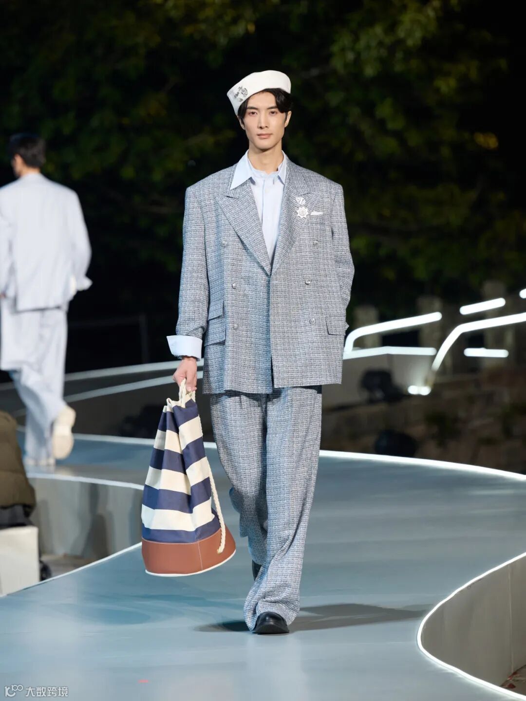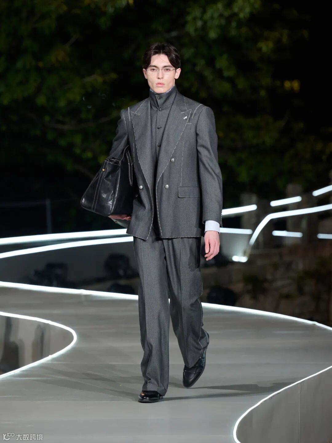 整场大秀在温州江心屿的古朴景致中展开,模特穿梭于光影之间,配合沉浸式的舞美设计,将西服从静态的展品变为流动的叙事。