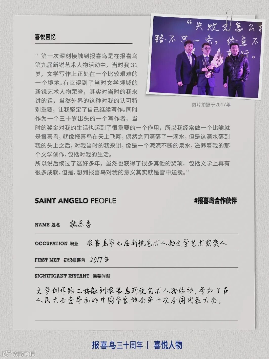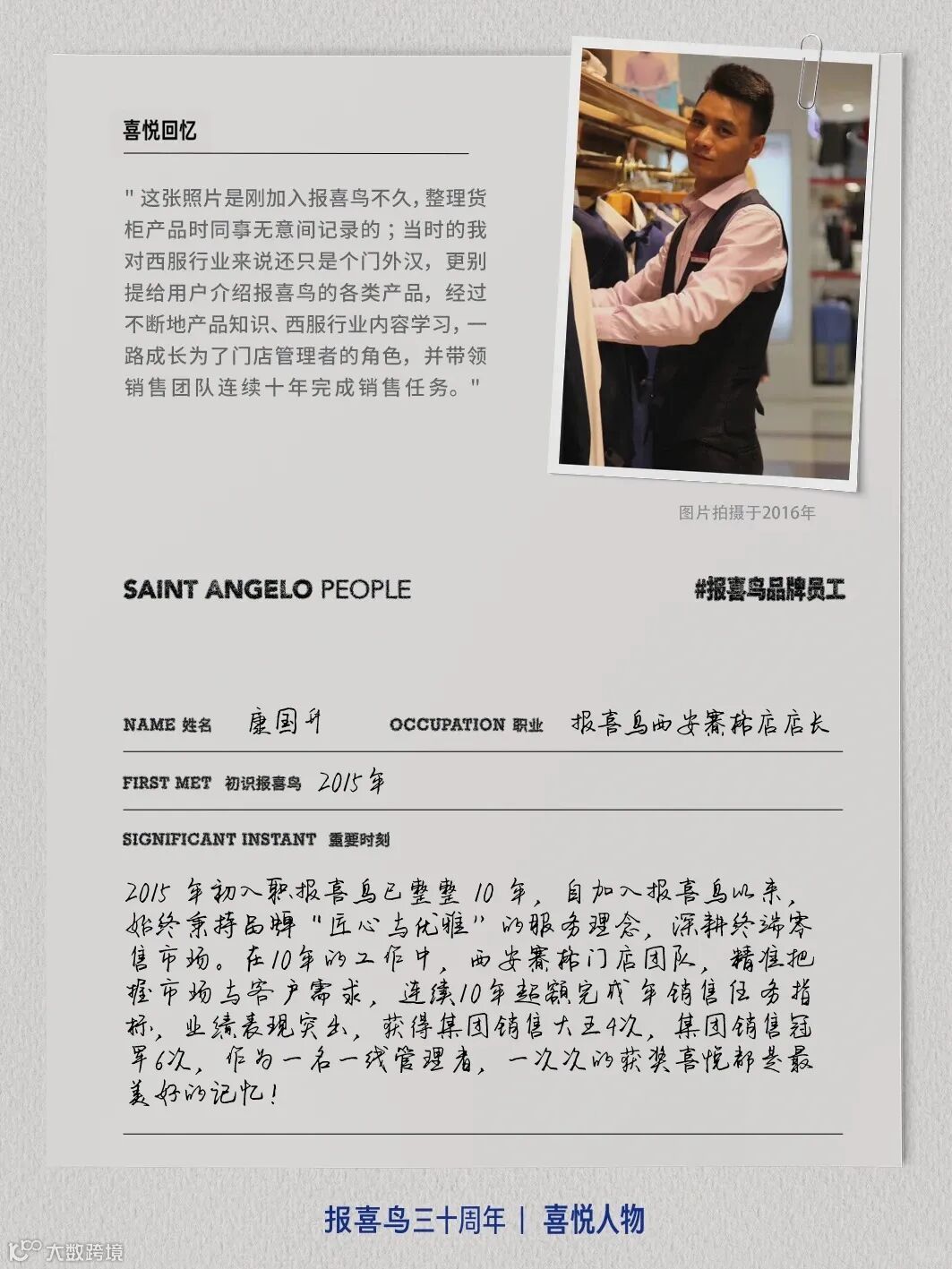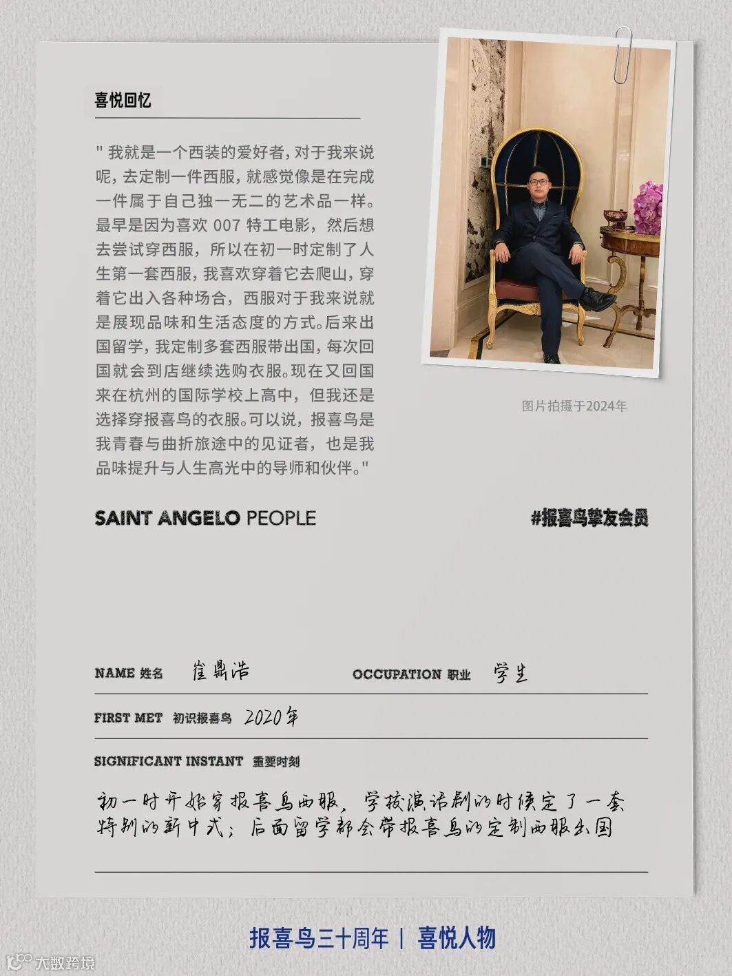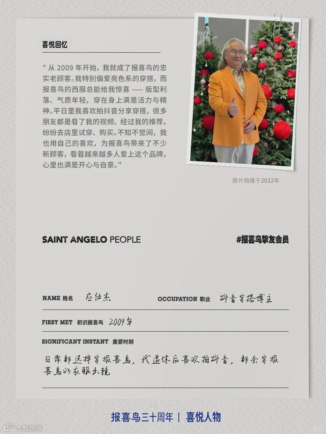 基于此,报喜鸟全网搜集、深挖与报喜鸟结缘的用户故事,他们当中有十几岁就穿报喜鸟的学生,有已近花甲始终偏爱报喜鸟的抖音博主,有在创业之初就加入的加盟商,也有在不同岗位上陪伴报喜鸟走过10年甚至更久的员工……