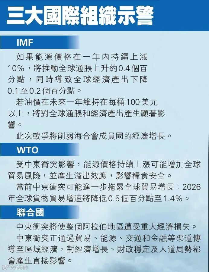最近,国际货币基金组织(IMF)、世界贸易组织(WTO)以及联合国有关机构均表示,正密切关注中东战火及其对能源生产造成的冲击,并发出警告:若能源价格持续上涨,可能在全球范围内推高通胀并拖累全球贸易及经济增长。