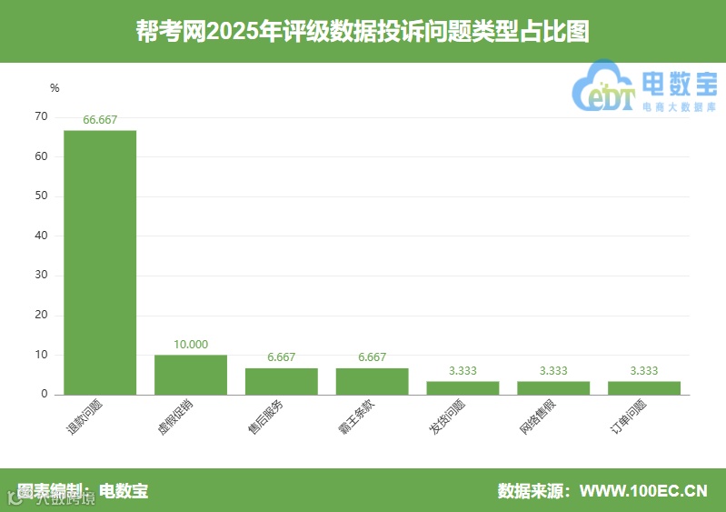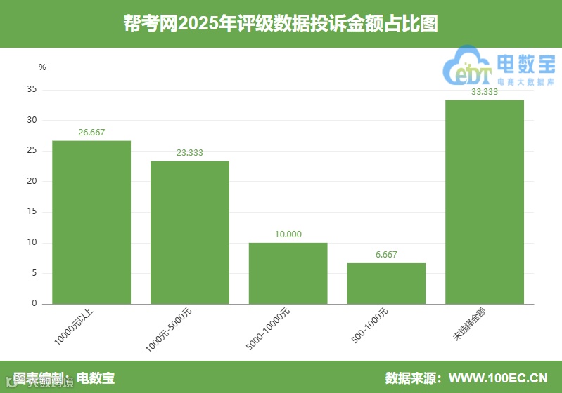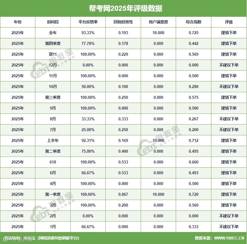 据网经社旗下电商大数据库“电数宝”监测数据显示,2025年“帮考网”共获得19次消费评级,13次为“谨慎下单”,6次为“不建议下单”;2025年整体消费评级为“谨慎下单”。该企业已入选《2025年度中国数字教育投诉数据与典型案例报告》(报告下载:https://www.100ec.cn/zt/2025szjybg/),并发送给在网经社注册的5000+记者库。