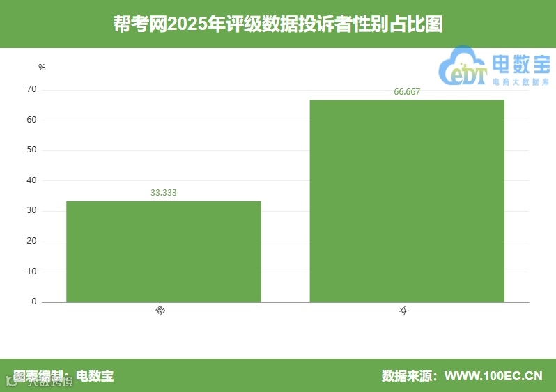 根据网经社旗下电商大数据库“电数宝”显示,投诉“帮考网”男性用户投诉比例为33.333%,女性用户投诉比例为66.667%。